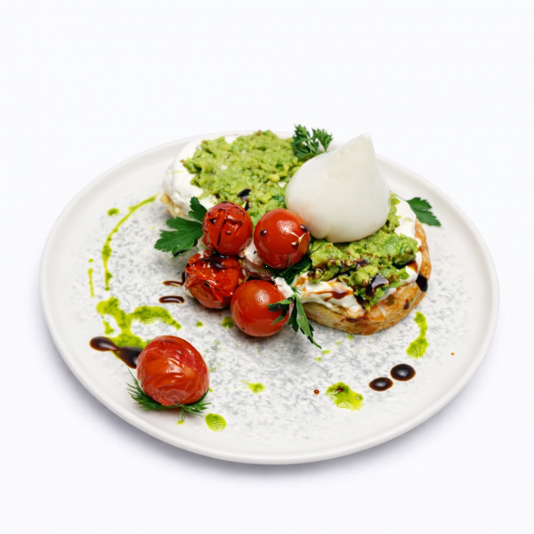 Пшеничный хлеб на закваске, мусс из сливочного сыра, гуакамоле, яйцо пашот, подпеченые томаты черри, бальзамический крем