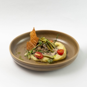 Классика, знакомая каждому! Сочная телятина со свежими грибами под сливочным соусом, подается с нежнейшим картофельным пюре.