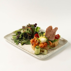 Изысканный легкий завтрак: брускетты со слабосоленым лососем и яйцом пашот, залитый нежным соусом Голландез, в сочетании с миксом из хрустящих листьев салата и вяленных помидоров черри.