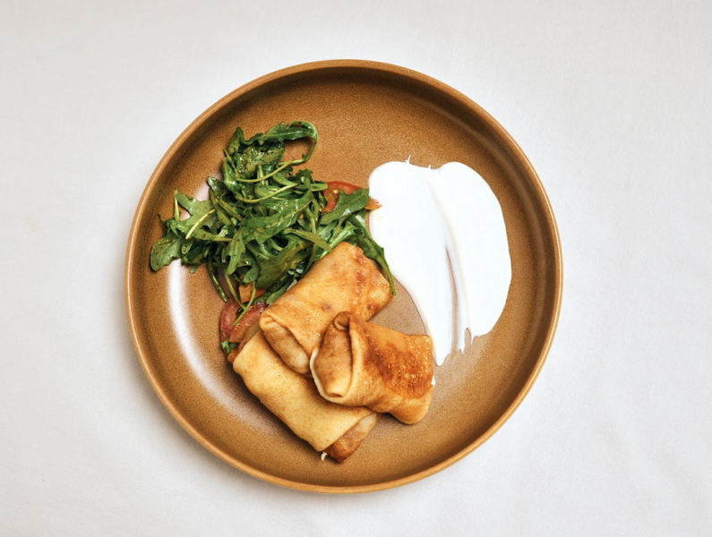 Тонкие румяные блинчики с сочной телятиной с луком, со сметаной и пряным салатом из руколы и помидорами.
