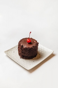 Нежнейший шоколадный бисквит в сочетании с насыщенным вишнёвым конфи из свежих ягод и кремом из тёмного шоколада.