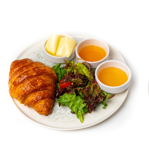 Воздушный классический круассан с медом, сливочным маслом и фруктовым джемом, подаётся с лёгким салатом из свежих огурцов и томатов под ароматным винегретом - настоящий утренний шик по-французски.