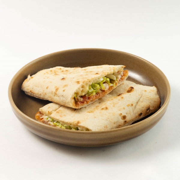 Сэндвич, запеченный в печи с куриной грудкой, соусом Ранч, томатным соусом, свежими томатами, салатом Айсберг и моцареллой.