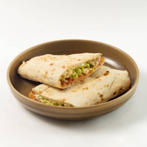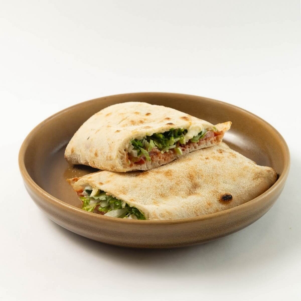 Сэндвич, запеченный в дровяной печи с добавлением малосоленой семги, сливочного соуса, свежих томатов и моцареллы в рассоле