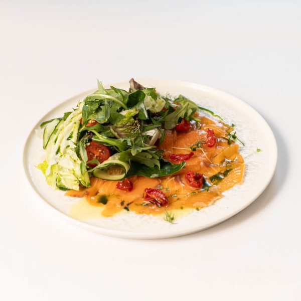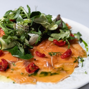 Традиционная итальянская закуска на основе нарезки малосольной семги в сопровождении зеленого салата и пряной заправки