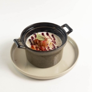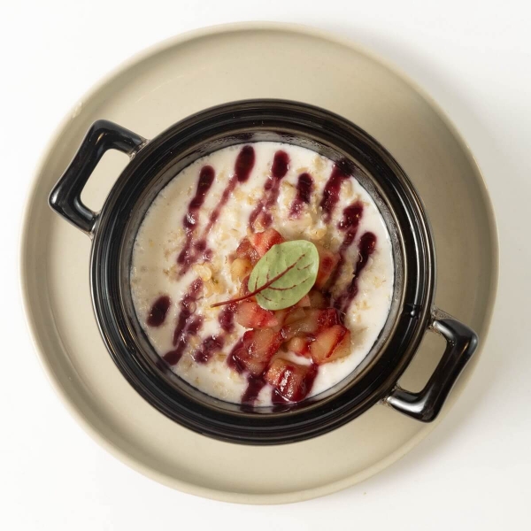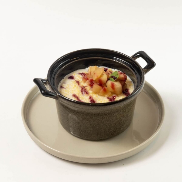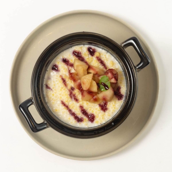 Полезнейшая каша на основе молока, сливочного масла и пшенной крупы в сочетании с карамелизированным яблоком и ягодным конфитюром.