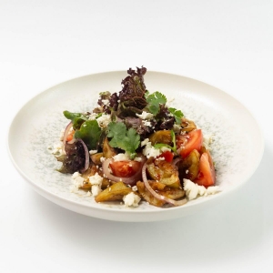 Пикантный салат из хрустящих баклажанов, в сочетании с турецким сыром, свежими томатами, листьями салата и лолло росса. Заправляется кисло-сладким соусом.