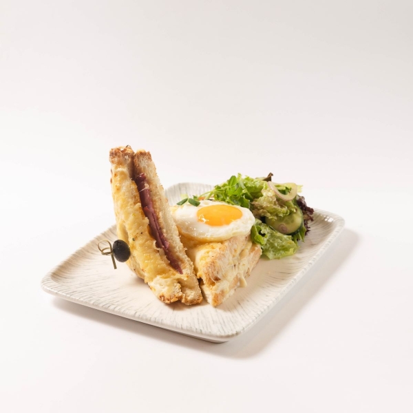 Классический французский сэндвич с говядиной горячего копчения, сыром , соусом Бешамель и глазуньей сопровождается фреш салатом