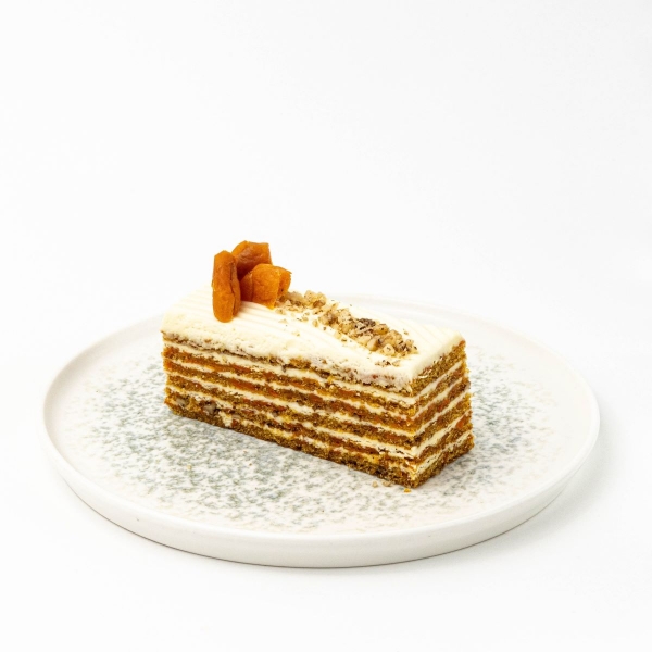 Полезный и сочный морковный десерт в основе которого морковь, кардамон, тростниковый сахар, мусковадо, грецкие орехи, с прослойкой крем чиз.