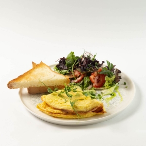Супер воздушный и нежный омлет, дополненный миксом из свежих листьев салата и хрустящими тостами. Вы можете разнообразить омлет нашими разными добавками :