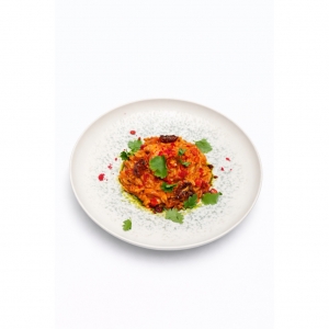 Паста Орзо, креветки, красный лук, томаты, чеснок, базелик, томатный соус, сливки, икра тобико, перец чили