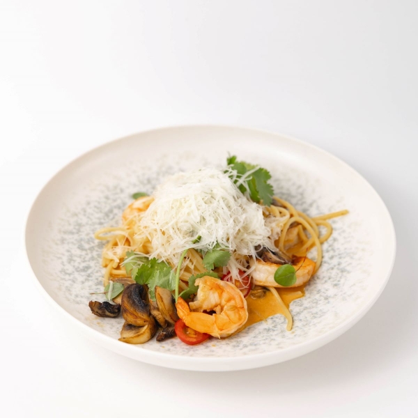 Переработанная итальянская паста в сочетании с традиционым тайским соусом "Том ям" и тигровыми креветками.