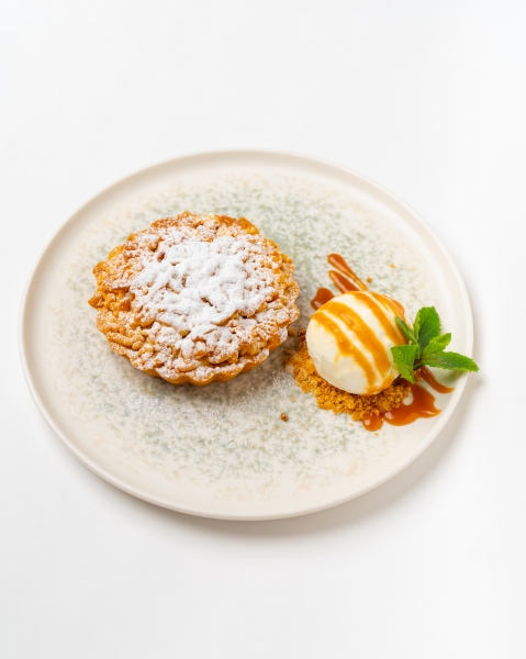 Песочная основа с яблочной начинкой , шариком ванильного мороженого и домашним карамельным соусом
