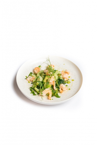 Освежающее сочетание креветок-гриль, авокадо, огурцов, шпината и зелёного лука с винным уксусом и морской солью - лёгкий, но яркий вкус моря.