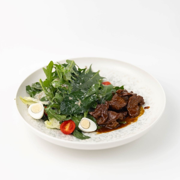 Зеленый микс салатов с томатами черри,яйцом перепелки, нежнейшим бон филе с эксклюзивным маринадом.