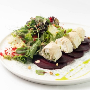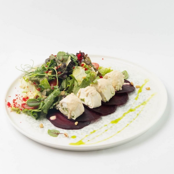 Зеленый микс салатов со свеклой,куриным роллом с сливочным сыром,икрой тобико,томатами черри и орехами кедра, заправленный кунжутным соусом