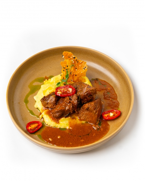Томлёные до мягкости говяжьи щёчки, сливочное пюре, зелёный горошек и ароматный соус демигляс - уютное и благородное блюдо.