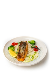 Запечённая сёмга на подушке из риса в сливочном соусе с брокколи и редисом - деликатный вкус и текстурный баланс.