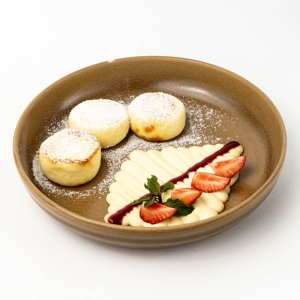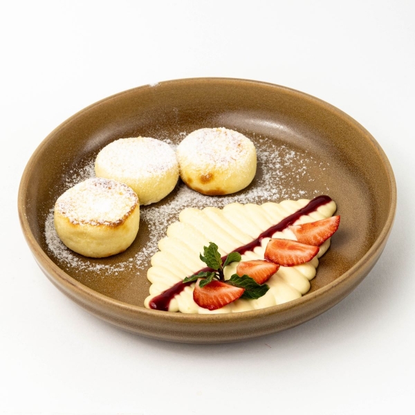 Нежнейшие сырники из домашнего творога, воздушного ванильного соуса и ягодного конфитюра из свежей смородины, клубники и малины