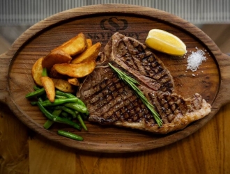 Стейк Ти-Бон объединяет в себе сразу два вида мяса: самый нежный в мире тендерлойн и яркий, насыщенный стриплойн. Назван так буквально за внешний вид брутальной кости, разделяющей два куска. Подается вместе с картофельными дольками и стручковой фасолью. Выбор соуса остается за вами.
