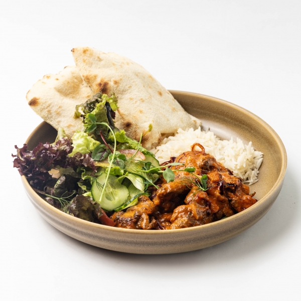 Знаменитое блюдо индийской кухни - отличное решение для любителей острой пищи. Нежнейшая курица, приправленная пряными специями, под соусом из сочных томатов, подается с отварным рисом и салатом из свежих овощей и зелени