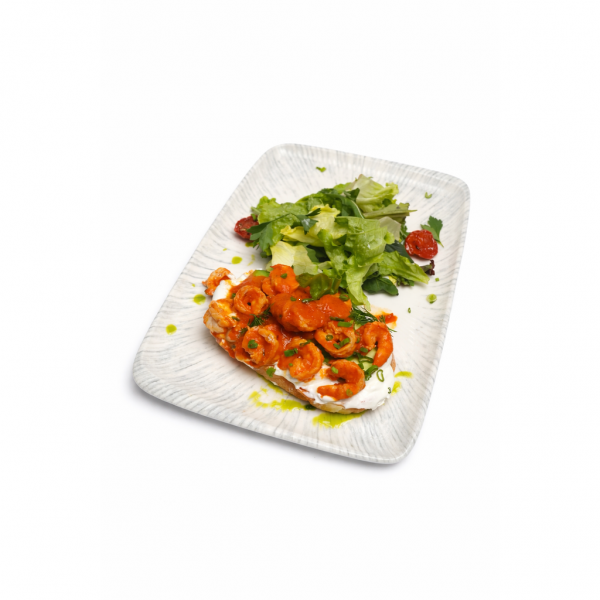 Пшеничный хлеб на закваске, сырный мусс, креветки в томатном соусе, зеленый микс салатов