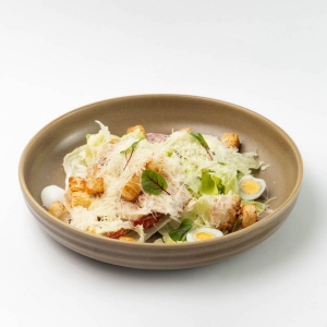 Классический итальянский салат с куриным филе, салатом айсберг, помидорами черри, заправленный соусом цезарь, посыпается сыром пармезан и гренками