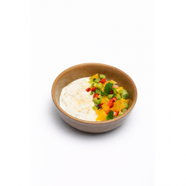 Домашний творог, сметана, сахарная пудра, фруктовый салат: клубника, киви, апельсин, кленовый сироп, мята