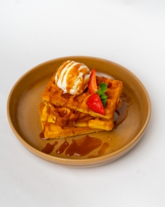 Бельгийские вафли с домашним карамельным соусом и ванильным мороженым.