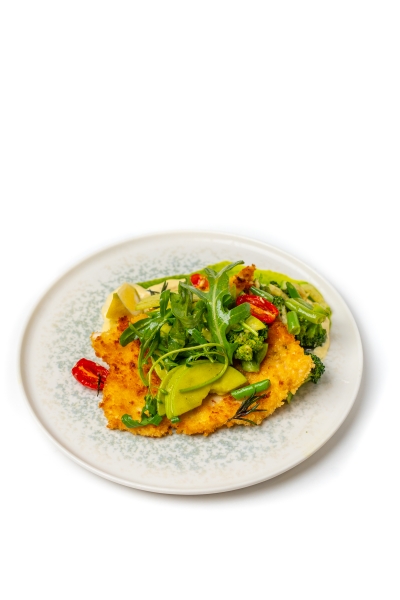 Хрустящая куриная грудка в панировке с гарниром из брокколи, фасоли, зелёного горошка, вяленых томатов и свежего яблока - классика с новым акцентом.