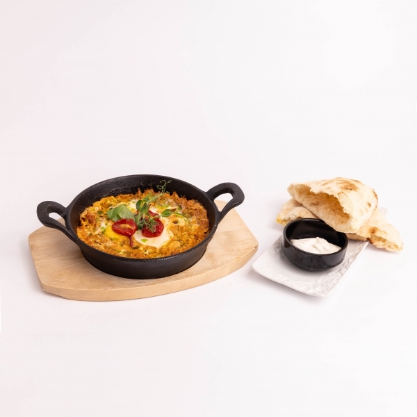 Фирменный завтрак из соуса болоньезе и двух яиц, готовится в печи при высоких температурах, в сочетании с домашней фокаччей - лучший вариант для плотного завтрака.