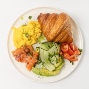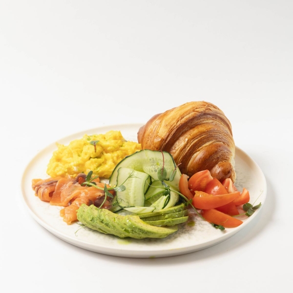 Классический хрустящий круассан в сочетании с нежным яичным скрэмблом,авокадо,малосольной семгой, свежими томатами и слайсами огурца придаст Вам заряд бодрости и позитивное настроение.